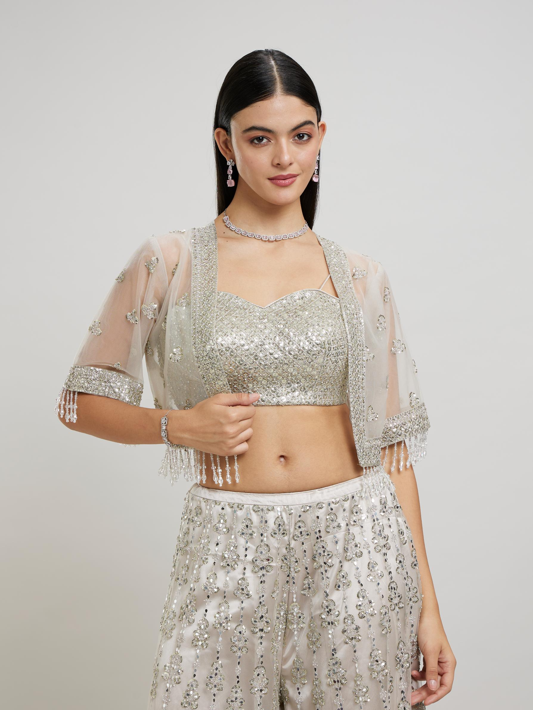 Regular price Rs. 1,299.00Sale price Rs. 1,299.00 Regular priceUnit price perRs. 3,999.00Sale Sold outColourFawn MaterialNet WorkHand Embroidery, Mirror Work, Sequin Work, Zari Items IncludedPalazzo , Top , Jacket Wash CareDry Clean Only DescriptionBe the personification of grace and style...