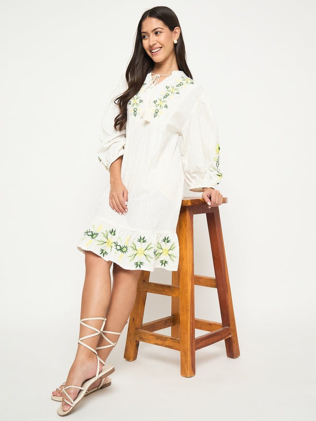 Regular price Rs. 699.00Sale price Rs. 699.00 Regular priceUnit price perRs. 999.00Sale Sold outFloral embroidery and a breezy fit-and-flare silhouette make this white mini dress a go-to for effortless charm. Perfect for brunches or daytime celebrations.